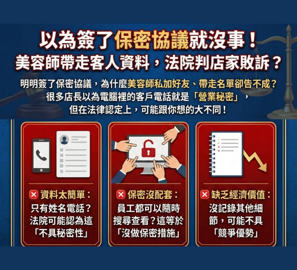 有一位美容師在某家美容美體店家做了兩年多之後離職,卻被前雇主告上法院,說他(red arrow right)竊取顧客資料,違反當初所簽的保密協議,所以求償200萬元違約金。