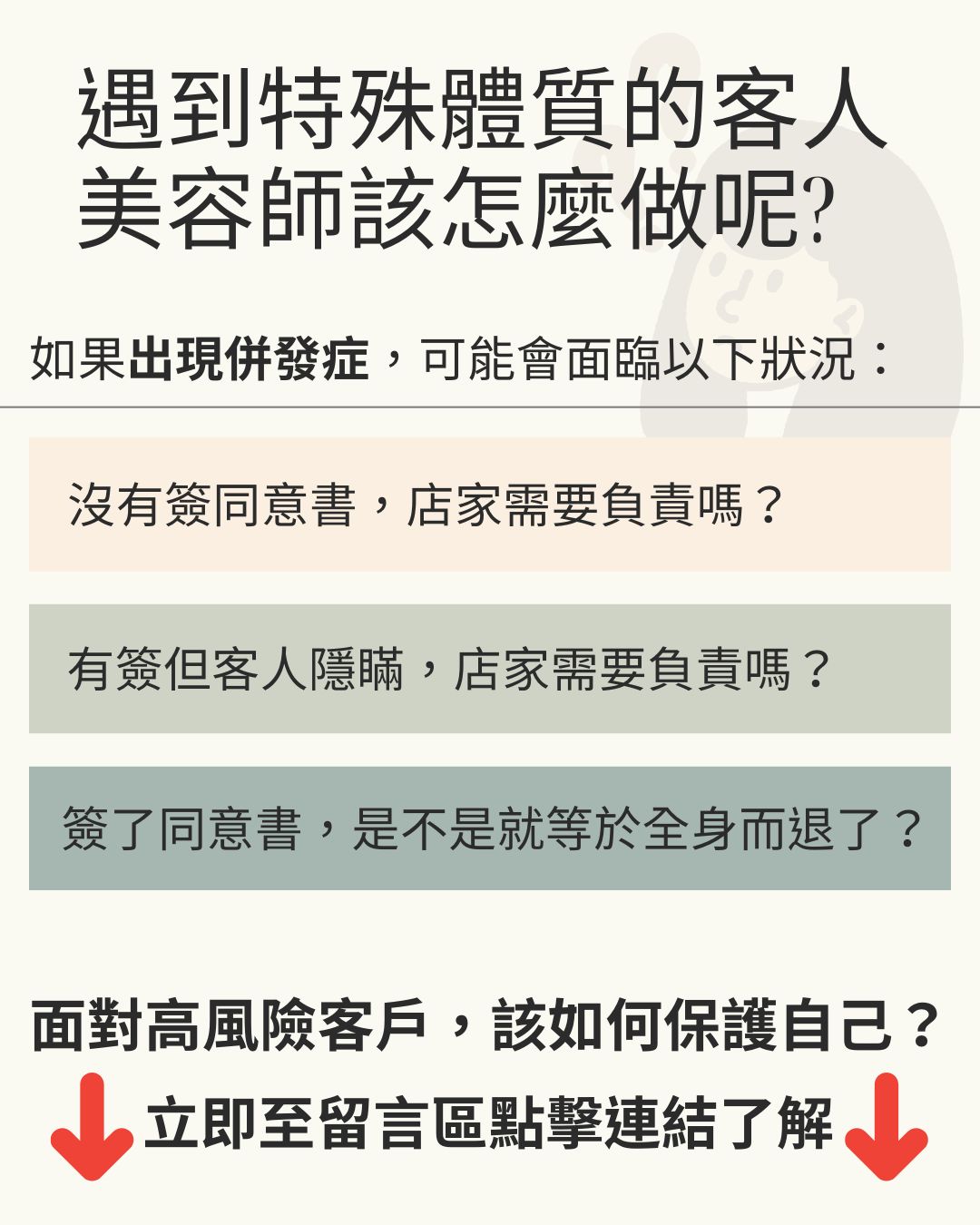 而其他的事情該問的有問、風險告知的也有告知、知道有不適合做的那就不要做,如果是對方不誠實或是本身也不清楚自己的狀況的,那麼在有簽署紋繡同意書的情形下,基本上就不會有太大的問題了,因為協會的紋繡同意書都已經有幫大家將各種情況都寫進去,紋繡師要做的就是畫重點、告知風險,並請消費者簽名就可以有效的保障自己的權益了!