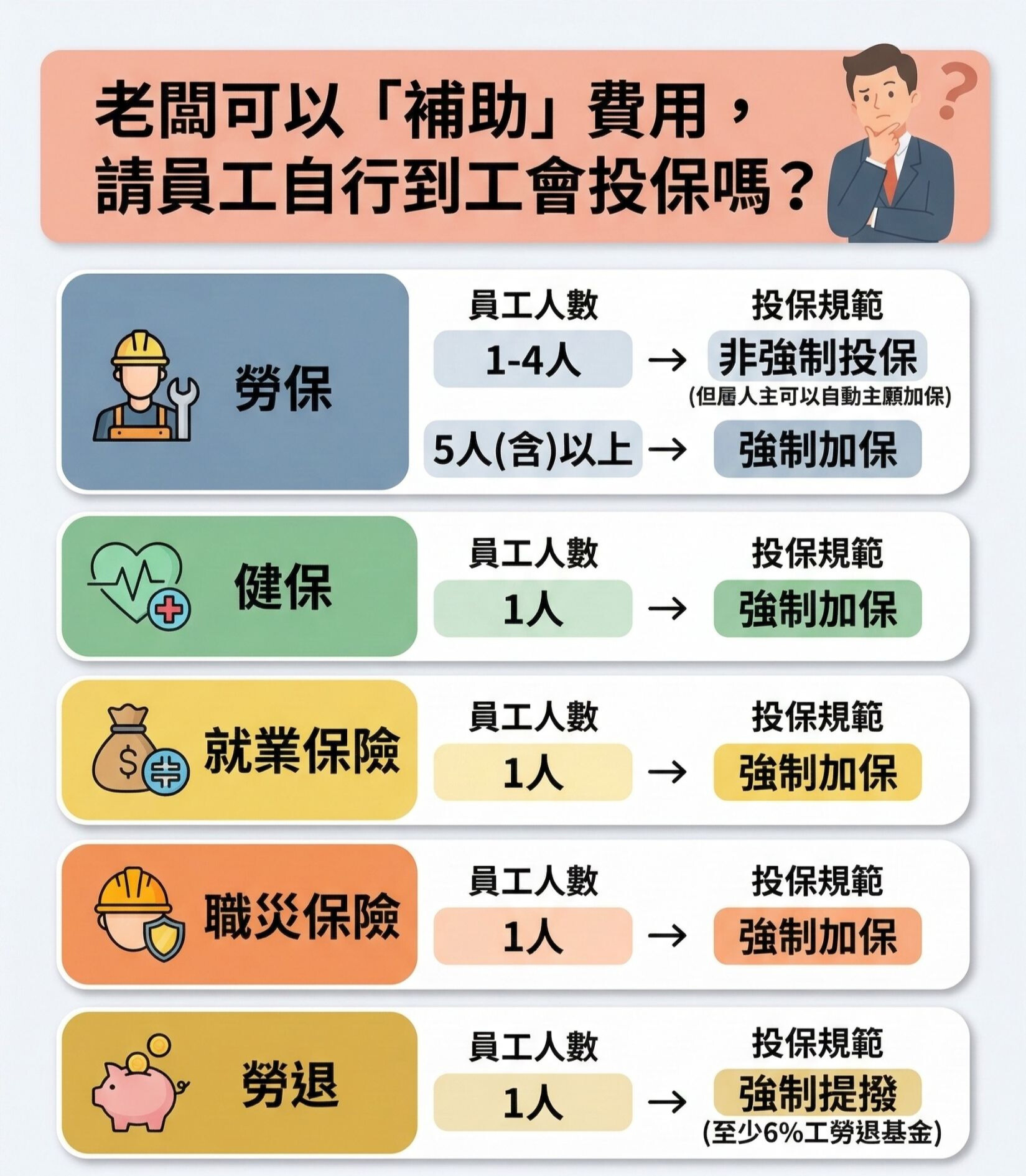 Q:老闆可以「補助」費用,請員工自行到會投保嗎?