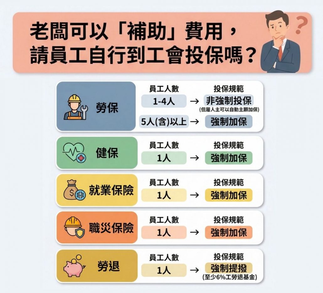 【老闆可以「補助」費用,請員工自行到工會投保嗎?】