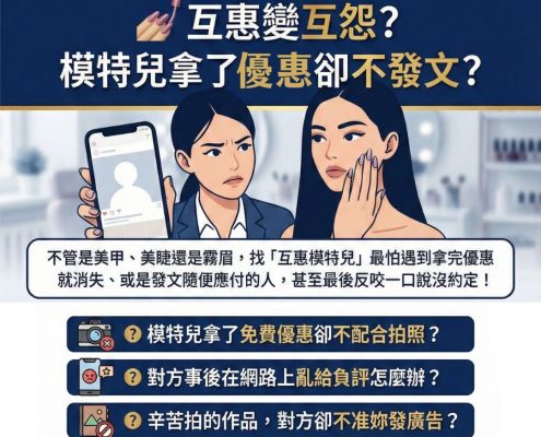 互惠變互怨?模特兒拿了福利卻不發文?不管是美甲、美睫還是霧眉,找「互惠模特兒」最怕遇到拿完優惠就消失、或是發文隨便應付的人,甚至最後反咬一口說沒約定!協會整理了美業專用的「四大防護條款」,讓妳的互惠合作不再心驚膽戰!