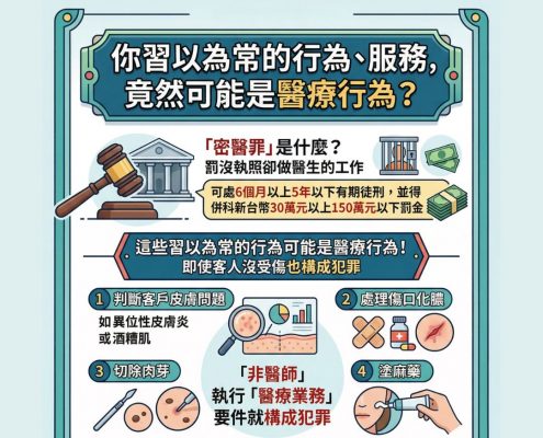 身為美容從業人員,熱心服務與「越界」往往只有一線之隔。大家常聽到的「密醫罪」,罰的不只是沒執照開刀,更多時候是罰「你沒醫師執照,卻做了醫生的工作」。不管客人有沒有受傷,之要你具備「非醫師」卻「執行醫療業務」的要件,就構成密醫罪。
