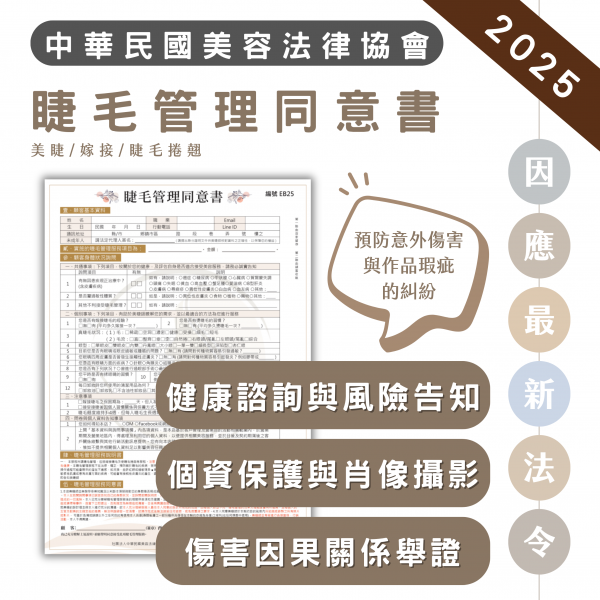 - 協會為「美睫業」專門設計的同意書,一份契約包含四種表單合併功能,省下填寫多份的困擾。內容包含:客戶基本資料、健康詢問紀錄、美容服務同意、個資使用同意。